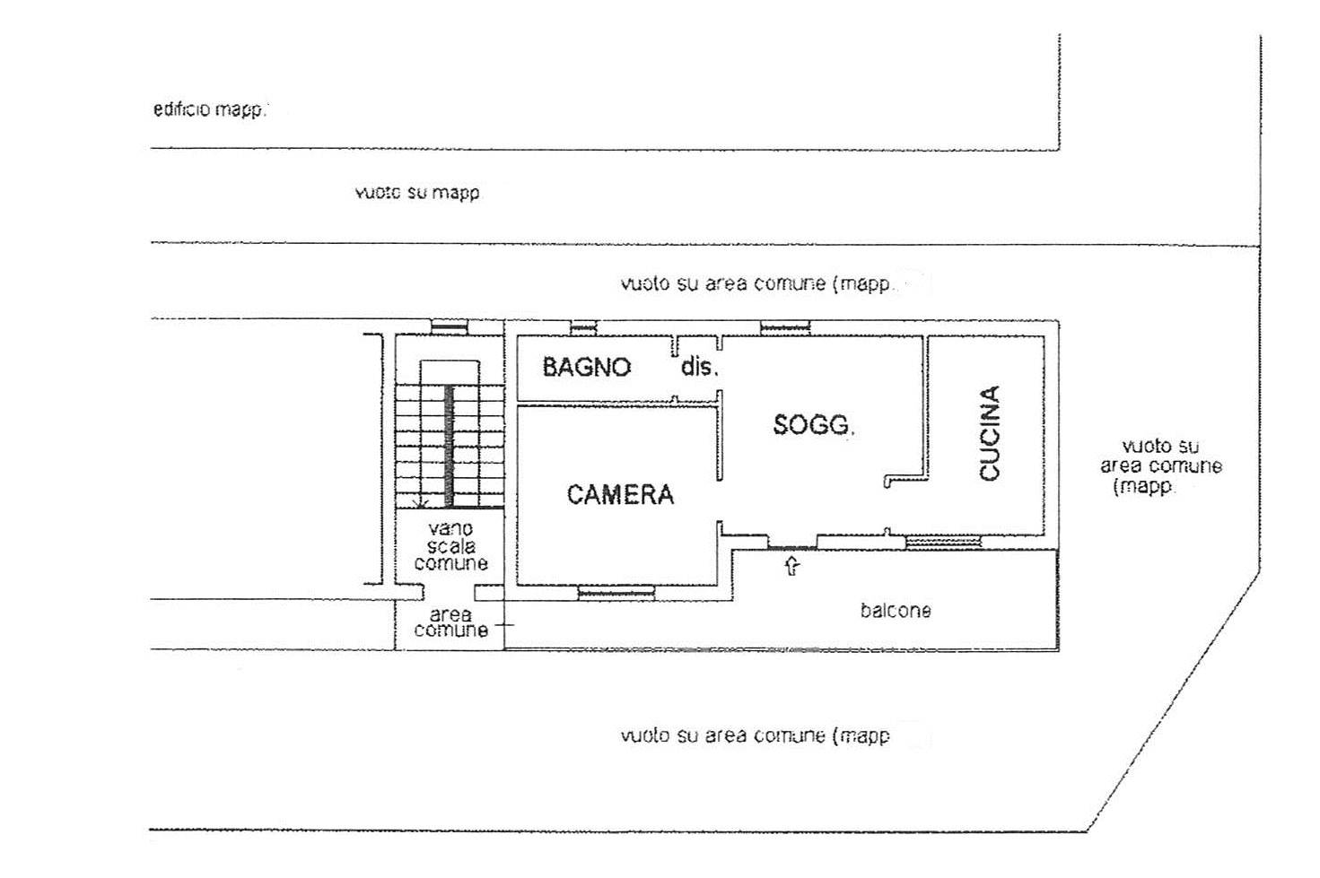 L'appartamento è così composto: ingresso nell'ampio soggiorno, cucina abitabile, spaziosa camera da letto matrimoniale, bagno e disimpegno.