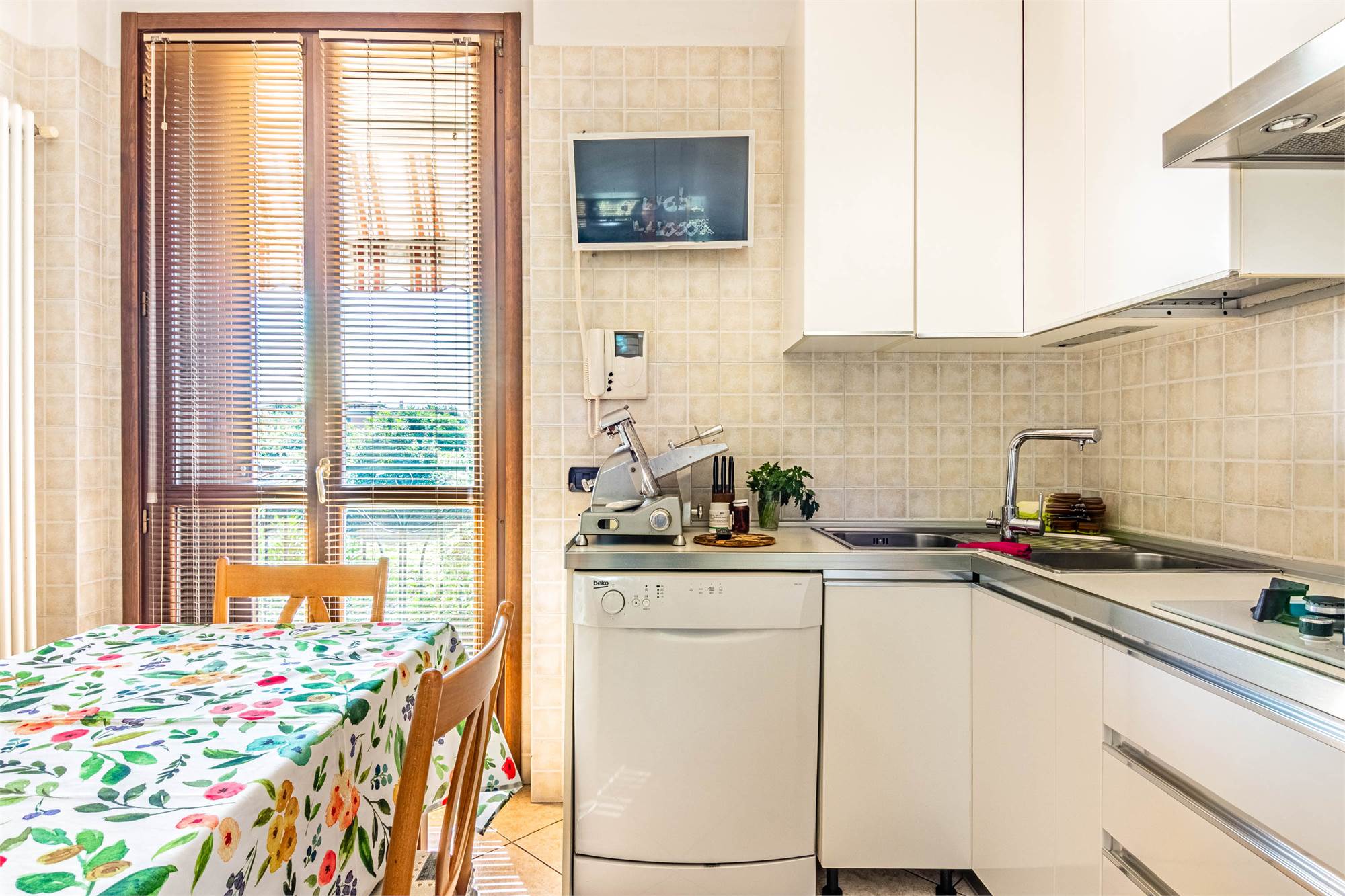 L’ingresso introduce a un AMPIO SOGGIORNO CON CAMINO e a una CUCINA ABITABILE, entrambi con accesso a un TERRAZZINO RISERVATO, affacciato sul VERDE CONDOMINIALE.